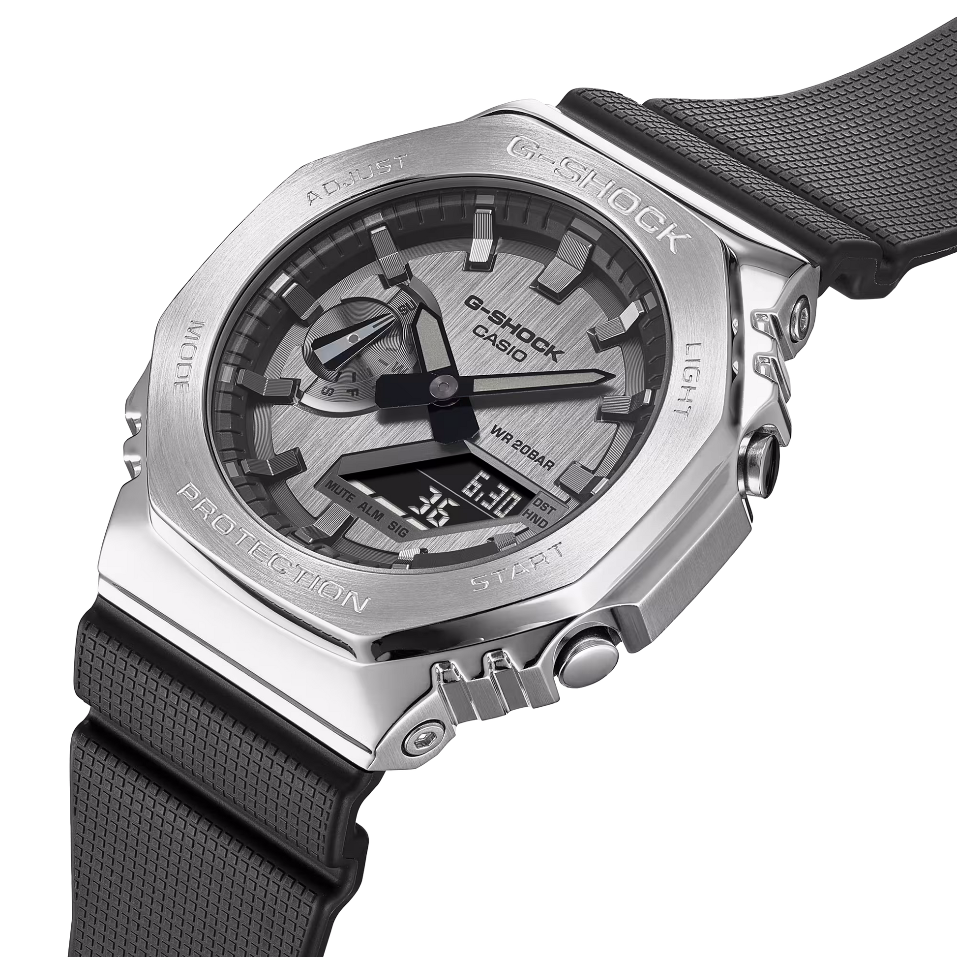 Un G-Shock robusto pero estilizado: combina la icónica forma octogonal inspirada en el “CasiOak” con un bisel de acero inoxidable pulido que le da presencia sin perder esa actitud resistente. Perfecto si querés un reloj fuerte para el día a día que también se vea bien con un outfit casual o urbano.